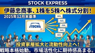 伊藤忠商事の株価は2025年12月29日、前日比5.33%高の2,015円と急伸し、年初来高値を更新した。2026年1月1日を効力発生日とする1株→5株の株式分割に伴う権利落ち日を迎え、投資単位の引き下げによる流動性向上や投資家層拡大への期待が高まった。加えて、年間配当210円相当を示す積極的な株主還元姿勢も評価された。さらに、セブン銀行株を20%取得し持分法適用会社化する資本業務提携を発表。ファミリーマート網とATM網を融合した「金融×リテール」の成長戦略が注目されている。堅調な中間決算を背景に、持続的成長への期待が株価を押し上げた。
